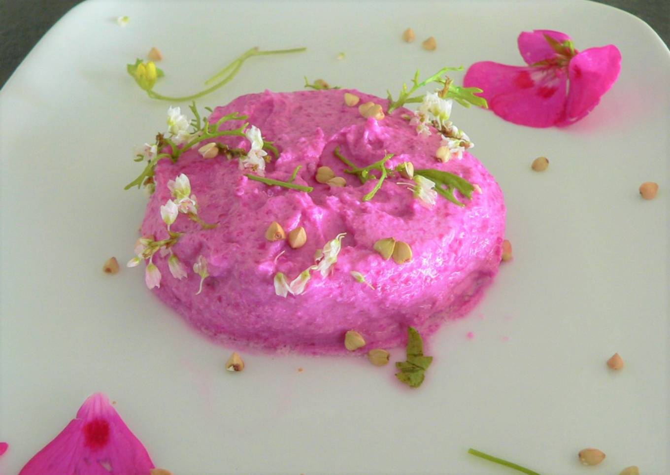 - Épluchez la betterave rouge, coupez là en morceaux. mixez la avec 1 c à soupe de citron sel et poivre.Retirez du mixeur, réservez. Remettez dans le mixeur propre le fromage de chèvre émietté mixez, ajoutez petit à petit la betterave afin d'obtenir une belle couleur rose.. Posez sur chaque assiette un fromage en vous servant d'un petit cercle à pâtisserie. Disposez des jeunes pousses et fleurs comestibles, saupoudrez de graines de sarrasin torréfiées Servez avec des toasts.