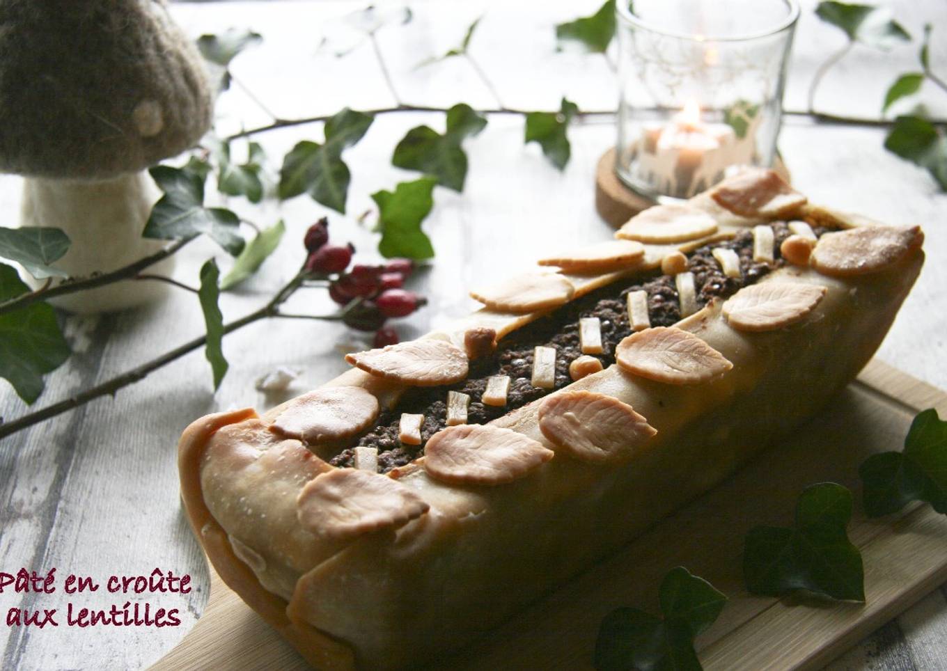 Refermez partiellement votre pâté en croûte aux lentilles, décorez-le à votre convenance avec les restes de pâtes brisée (ici des feuilles à l'emporte-pièce).