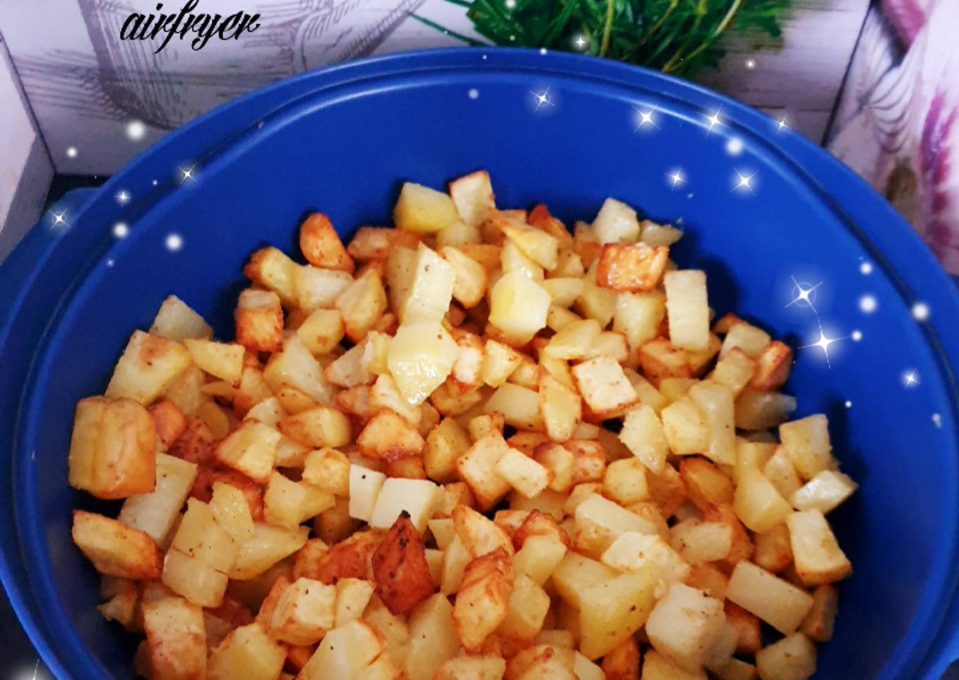 - Une fois les pommes de terre épluchées lavées et séchées. Couper les en cubes réguliers. Ajoutez les dans l'appareil à air chaud. Assaisonner,ajouter l'ail en poudre les herbes de Provence et L'huile d'olive.