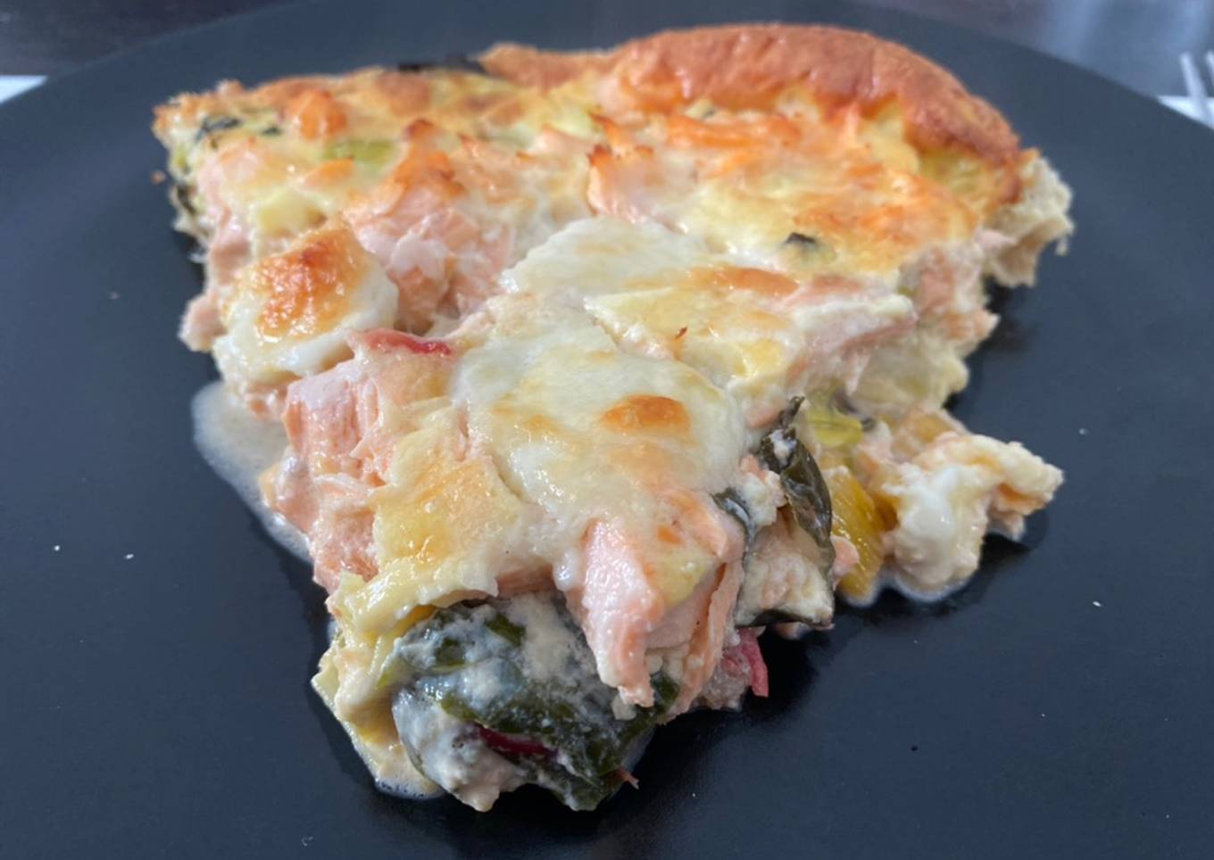 - Étaler la pâte brisée et Disperser le saumon cuit sur le pâté puis les légumes cuits. Ajouter l’appareil (oeus+crème), puis parsemer la mozzarella.