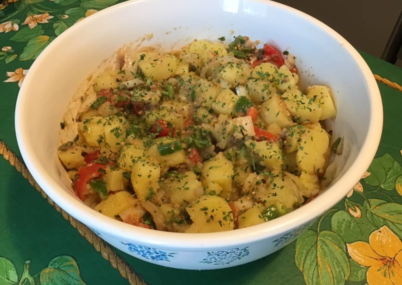 Salade tiède de pommes de terre,harengs marinés, tomates et poivrons verts