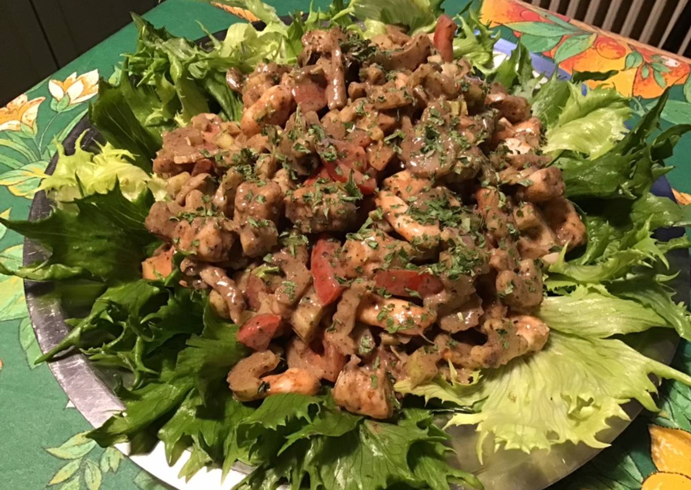 Salade de céleri jaune, reine des glaces,tomates et crevettes roses (sauce tapenade)